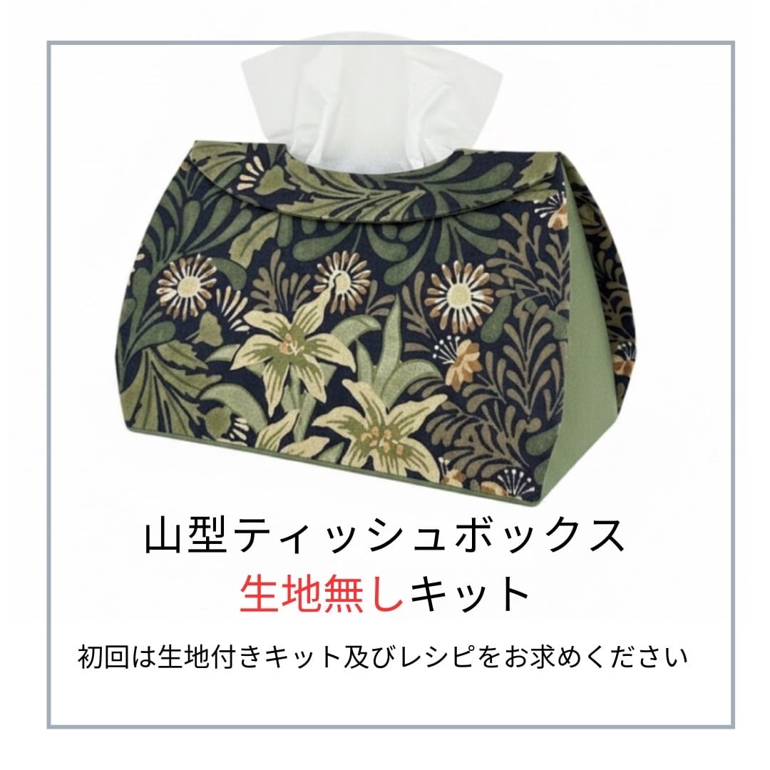初めてお作りになる方は、【山型ティッシュボックス生地付きキット】と【作り方レシピ3,500円】をご購入下さい。